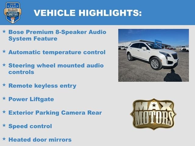 Crystal White Tricoat 2021 Cadillac XT5 Luxury4D Sport Utility Luxury AWD 2.0L Turbocharged21/27 City/Highway MPG 21/27 City/Highway MPG18 Multi-Spoke Alloy Wheels, Apple CarPlay/Android Auto, Automatic temperature control, Bose Premium 8-Speaker Audio System Feature, Exterior Parking Camera Rear, Front Bucket Seats, Garage door transmitter, Heated door mirrors, Heated Driver & Front Passenger Seats, Illuminated entry, Power Liftgate, Remote keyless entry, Speed control, Steering wheel mounted audio controls, Turn signal indicator mirrors, Variably intermittent wipers.Odometer is 29338 miles below market average!At Max Motors, our mission is simple: to provide every customer with a honest, transparent, and rewarding automotive experience. For 19 years as a family-owned business, we build strong customer relationships that go beyond a sale. Buying a vehicle is significant, and we ensure the process is smooth and straightforward.