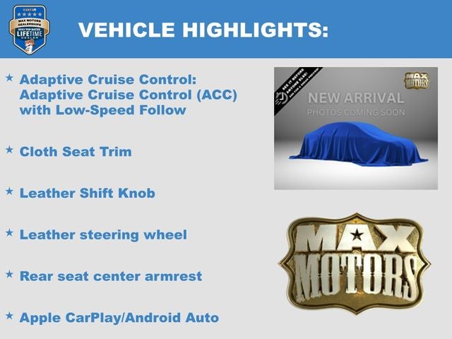 Cloth, Adaptive Cruise Control: Adaptive Cruise Control (ACC) with Low-Speed Follow, Apple CarPlay/Android Auto, Cloth Seat Trim, Exterior Parking Camera Rear, Four wheel independent suspension, Leather Shift Knob, Leather steering wheel, Power driver seat, Radio: 180-Watt AM/FM Audio System, Rear seat center armrest, Remote keyless entry, Steering wheel mounted audio controls.