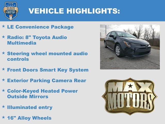 16 Alloy Wheels, Color-Keyed Heated Power Outside Mirrors, Exterior Parking Camera Rear, Front Doors Smart Key System, Illuminated entry, LE Convenience Package, Radio: 8 Toyota Audio Multimedia, Steering wheel mounted audio controls.