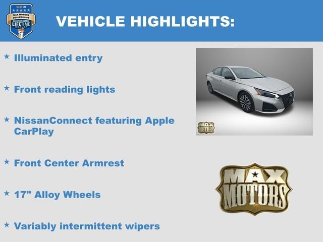Recent Arrival!Brilliant Silver Metallic 2024 Nissan Altima 2.5 SV4D Sedan 2.5 SV FWD 2.5L 4-Cylinder DOHC 16V27/39 City/Highway MPG 27/39 City/Highway MPGCVT with Xtronic, 17 Alloy Wheels, Front Center Armrest, Front reading lights, Fully automatic headlights, Illuminated entry, NissanConnect featuring Apple CarPlay, Power door mirrors, Radio: AM/FM Audio System, Rear Parking Sensors, Remote keyless entry, Security system, Speed control, Steering wheel mounted audio controls, Variably intermittent wipers.At Max Motors, our mission is simple: to provide every customer with a honest, transparent, and rewarding automotive experience. For 19 years as a family-owned business, we build strong customer relationships that go beyond a sale. Buying a vehicle is significant, and we ensure the process is smooth and straightforward.